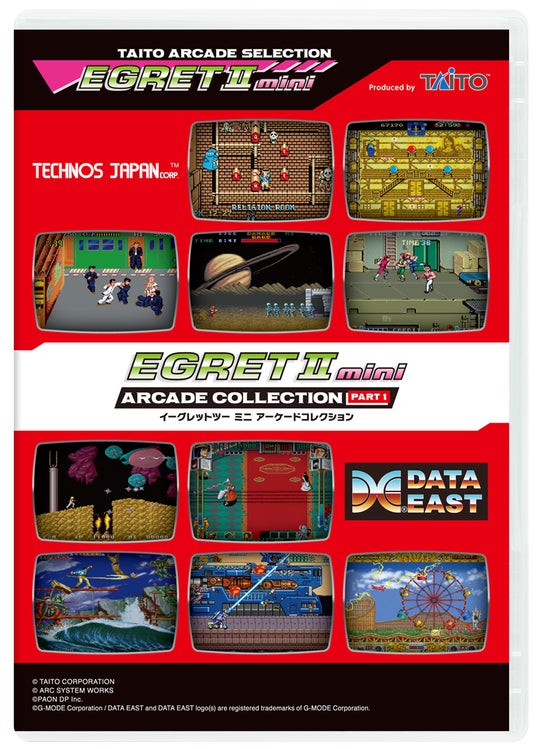 『アーケードコレクションPART1』は、ゲーム10タイトルを収録した『イーグレットツー ミニ』専用ソフト収録SDカードです。本体のSDカード用スロットに差し込むことで収録タイトルを遊ぶことができます。追加ソフト第4弾にして初めてタイトーブランド以外のタイトルをラインナップした今作では、レトロゲームファン向けに独自に行ったアンケートにて要望の高かった「ダブルドラゴン」や「ザ・グレイト・ラグタイムショー」をはじめ、「テクノスジャパン」および「データイースト」によって1984年から1992年までに展開された全10タイトルを収録しています。