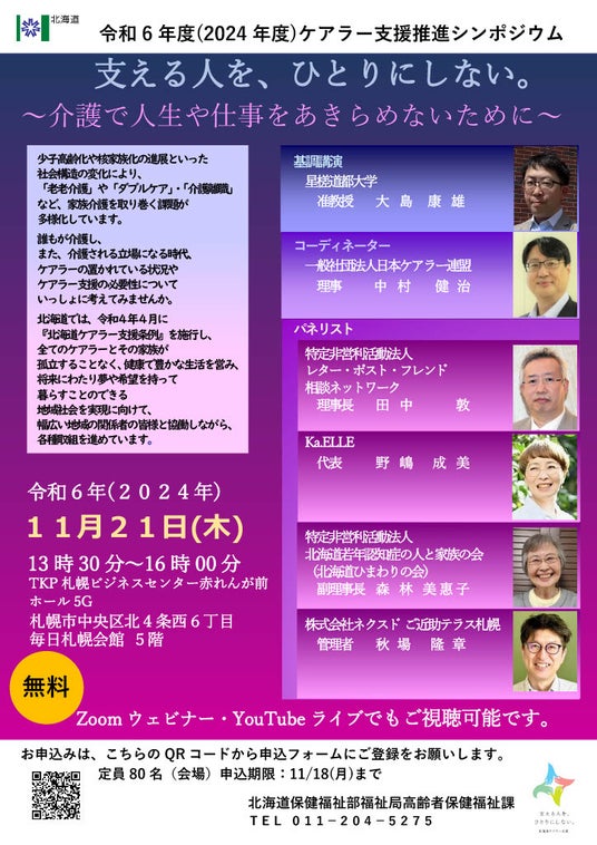 この一環として、ケアラーの置かれている状況やケアラー支援の必要性などについて理解を深めるた め、「令和6年度(2024年度)ケアラー支援推進シンポジウム」を11月21日(木)に開催します。