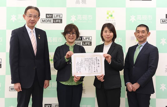 令和7年2月27日(木曜日)、NPO法人たかつき事業本部長の石神裕美子さんらが高槻市役所を訪問。NHK厚生文化事業団が主催し、認知症の人がいきいきと暮らすことができる活動を行っている団体を表彰する「第8回認知症とともに生きるまち大賞」を同法人が運営するデイサービス事業所「Roles晴耕雨読舎南平台」が受賞したことを濱田剛史市長に報告しました。