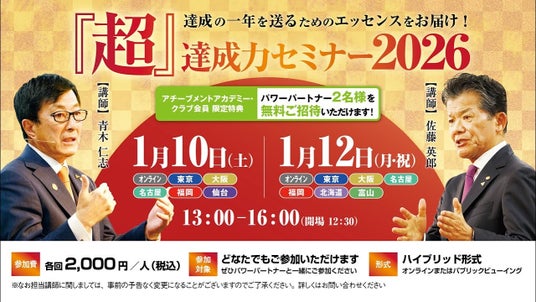 アチーブメント株式会社(本社:東京都江東区、以下弊社)は、2026年1月10日(土)、12日(月・祝)に『超』達成力セミナーを開催いたします。『超』達成の一年に向けて最高のスタートダッシュを切っていただけるよう、目標達成の技術を180分に凝縮してお伝えする毎年恒例のイベントで、全国から約6000名が申し込み。昨年からさらに拡大し、全国7か所でパブリックビューイングも開催いたします