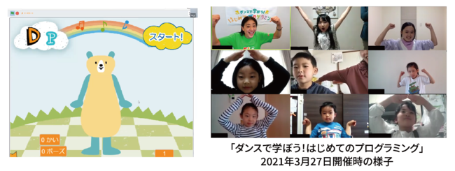 『ダンスで学ぼう!はじめてのプログラミング』は、コロナ禍においても子どもたちがプログラミングに触れるきっかけをつくることを目的として、2020年にFIFが企画・開発したオリジナルプログラムです。これまではオンラインにて開催してきましたが、今回初めてオンサイトで開催します。参加者は、教育プログラミング言語Scratchで作成したアプリケーションを活用し、オリジナルキャラクター「ロボクマ」と一緒にダンスをしながらプログラミングがどのようなものかを学びます。アプリケーション上のカードでポーズの順番や組み合わせを並び替え、自分の思い描くダンスを「ロボクマ」に踊ってもらうことで、プログラミングに必要なアルゴリズムの考え方にも触れます。