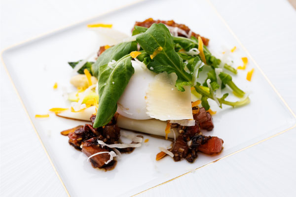 ソラマメ、グリーンピース、芽キャベツ、アスパラといった目にも優しい柔らかな緑をふんだんに使っています。