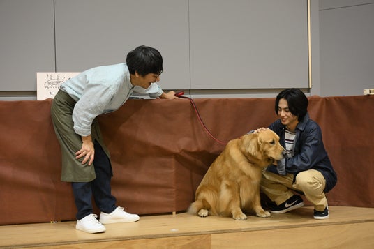 会見の中盤、スペシャルゲストとして、山崎演じる三ツ矢の飼い犬でありパートナーの“フリト”が登場。