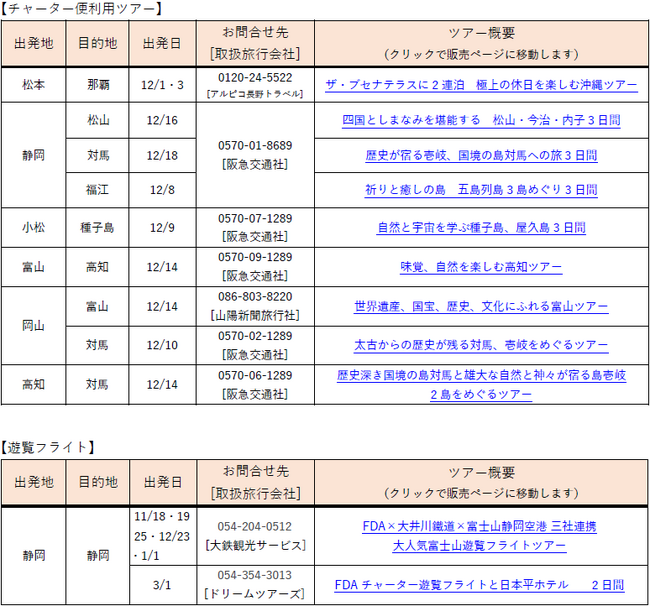 上記は、現在一般販売している旅行ツアーの一部となります。全てのチャーター便・遊覧フライトの運航予定を記載しているものではありませんのでご了承ください。