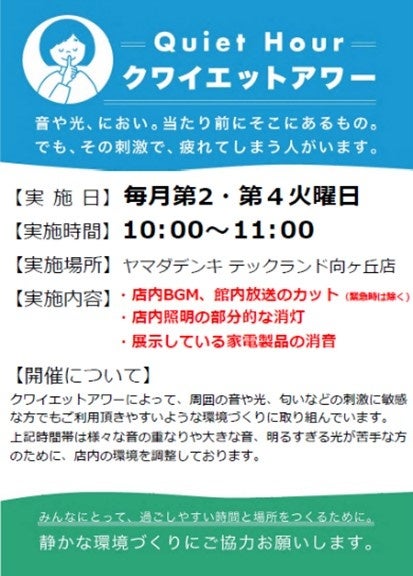 ヤマダデンキでは、2023年5月より、テックランド相模原店にて「クワイエットアワー」を定例実施しています。この度、社会課題のさらなる認知拡大と、誰もが過ごしやすい環境づくりに貢献したいという想いから神奈川県内のヤマダデンキにおいて実施店舗を拡大することといたしました。