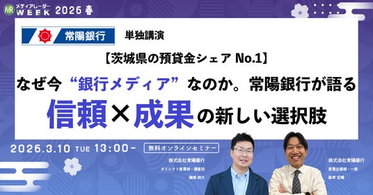 株式会社アイズ(所在地:東京都渋谷区、代表取締役社長:福島範幸、東証グロース:5242)が運営するNo.1*の広告業界のプラットフォーム「メディアレーダー」が主催するマーケティングセミナーイベント「第21回メディアレーダーWEEK 2026 春」にて、株式会社常陽銀行様が3/10(火)に登壇します。視聴申し込みは無料です。