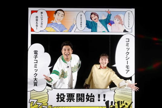 その後、お二人は、投票開始を記念してマンガコマ風のパネルから顔を出し、「コミックシーモア!電子コミック大賞!投票開始~!!」と大きな声で投票開始を宣言。木村さんは「決まりましたよね?もっと拍手があってもいいのでは?」とコメントし、会場を笑いに包みました。