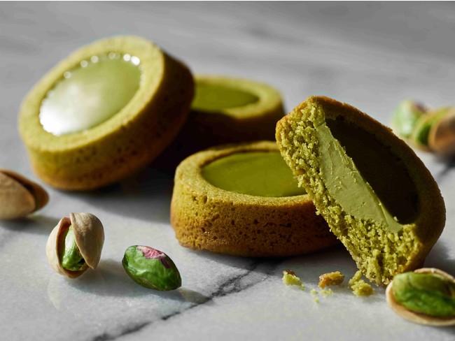 ピスタチオケイク生地を高温短時間で表面をカリッと焼き上げ、やわらかいピスタチオチョコレートを流し込み冷やすことで生地表面がしっとりとなじみ、チョコレートとの一体感がうまれました。