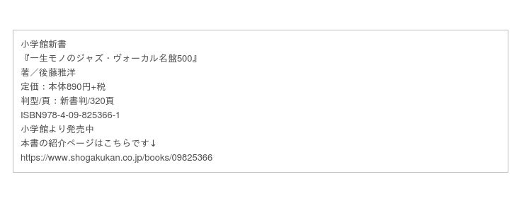 多くの人がその日の気分によって「今日は焼肉が食べたいな」とか、あるいは「さっぱり蕎麦といくか」といった具合に食事の献立を変えるように、この本の項目別、あるいは声質ガイドを参考にしていただき、「日替わりお好みメニュー」で多彩極まりないジャズ・ヴォーカルの世界を楽しんでいただければと思います。››