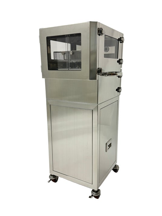 再生医療の研究・製造現場における無菌操作で必要な物品除染に特化した移動式の除染ボックスです。ボックス内の専用ラックに注射針や滅菌チューブ等の使用物品を入れて除染した後、装置をクリーンベンチや安全キャビネット等の前に置き、装置から物品が入ったラックをスライドさせてクリーンベンチ等に搬入します。これにより、高い清浄度環境を維持した物品搬送を可能とし、拭き取り作業や偽陽性対応にかかる工数を大きく削減します。