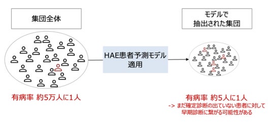 HAEは5万人に1人の有病率と言われている中、本モデルによる今回の検証では、HAEの可能性が高いとして抽出された患者のグループにおいては、約5人に1人の割合でHAEの確定診断、またはHAEの疑いがある旨の記録がされていました。この結果から、これまでHAEの診断記録がない患者においても、本モデルの適用結果を活用することにより、HAEの早期診断に寄与しうると考えられます。