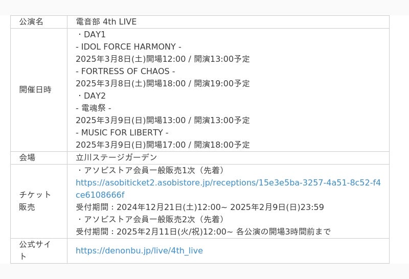 2025年3月8日・9日開催の「電音部 4th LIVE」にBellemuleが出演します。イベント詳細は公式サイトをご確認ください。