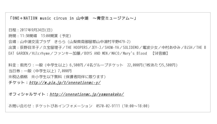 2017年9月24日(日)山中湖交流プラザ きららで開催いたします、「ONE+NATION music circus in 山中湖 ~青空ミュージアム~」の追加アーティストが下記4組決定しました。