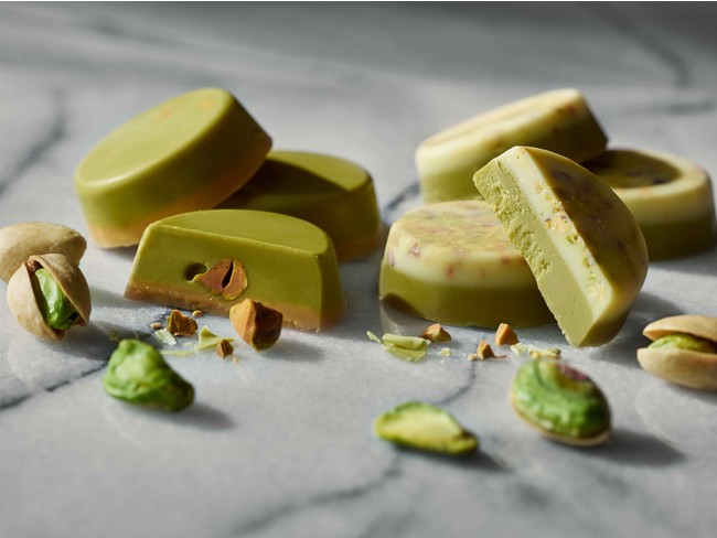 2種のピスタチオチョコレートと大きめピスタチオを閉じ込めた「ピスタチオ&ピスタチオ」、ピスタチオチョコレートに刻みピスタチオとホワイトチョコレートを重ねた「ピスタチオ&ホワイトチョコレート」。食感の異なる2種のピスタチオショコラをアソートにしました。
