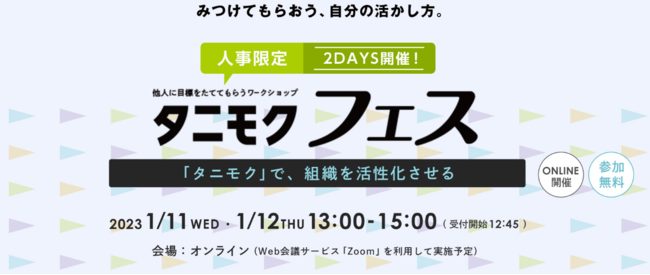 転職サービス「doda」などを提供するパーソルキャリア株式会社(本社:東京都千代田区、代表取締役社長:瀬野尾 裕)が運営する、他人に目標をたててもらうワークショップ「タニモク」は、2023年1月11日(水)・12日(木)に【「タニモク」で組織を活性化させる】をテーマにした、人事限定のオンラインイベント「タニモク」フェスを開催します。