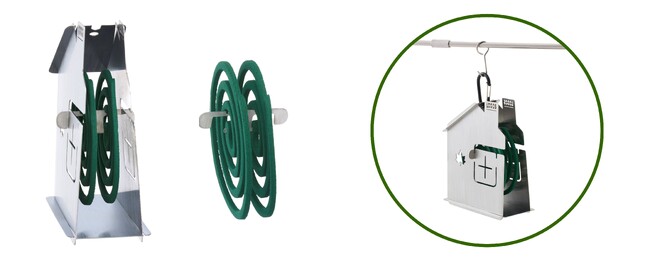 2巻きの蚊取り線香を同時に取り付けられる。発煙量を増やせるほか、時間差で点火すれば長時間の効果が期待でき、キャンプなどのアウトドアシーンに活躍。付属のカラビナを使えば吊り下げることもできる。