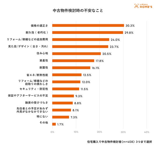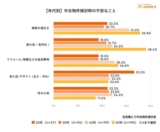 【2】中古物件検討時の不安なことは「価格の適正さ」「耐久性」と3人に1人が回答、年代別で差も。