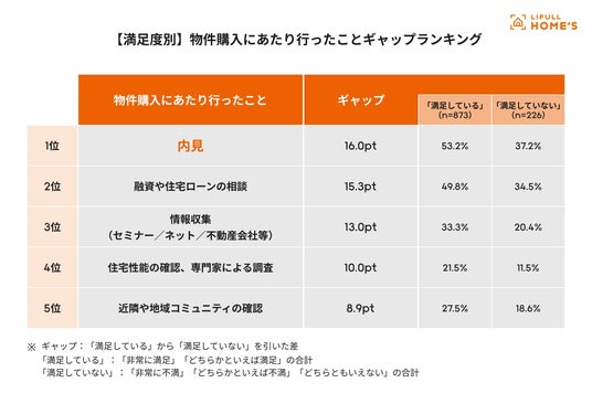 すべての住宅購入者の購入後の満足度別に「物件購入にあたって行ったこと」のギャップを調べたところ、満足している方(「非常に満足」「どちからかと言えば満足」の合計)と満足していない方(「非常に不満」「どちからかと言えば不満」「どちらともいえない」の合計)のギャップ1位は「内見」(16.0pt)となり、購入後の満足している方は「内見」を重視していたことが分かりました。
