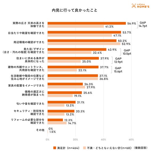 さらに、内見に行って良かったことについて、満足している方とそうでない方(「非常に不満」「どちらかといえば不満」「どちらともいえない」の合計)で最も差がついた項目は、「建物の外観やエントランス、共用部を確認できた」(GAP15.6pt)でした。このほかに10Pt以上の差があった項目は「実際の広さ・天井の高さを体験できた」(GAP14.7pt)、「住まいに求める条件が具体的になった」(GAP12.9pt)、「見た目/デザイン(古さや汚れの程度)を確認できた」(GAP10.5pt)で、内見で実際に住んだ後の生活を具体的に体験、確認できることが満足度を高めることに繋がりそうです。