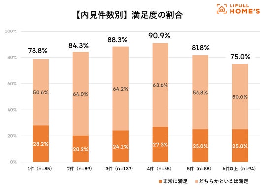 物件購入にあたり行っていたことで「内見」を選んだ方の内見件数別に、購入後の満足度を調べたところ、満足している方(「非常に満足」「どちらかといえば満足」の合計)の割合が最も高いのは「4件」(90.9%)でした。次いで、「3件」(88.3%)、「2件」(84.3%)、「5件」(81.8%)という結果でした。しかし、「6件以上」では割合が75.0%と大幅に下がることも分かりました。