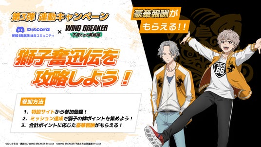 Discordコミュニティの企画・運営支援を行うナイル株式会社(本社:東京都品川区、代表取締役社長:高橋飛翔、以下ナイル)は、株式会社講談社(本社:東京都文京区、代表取締役社長:野間省伸)が提供するTVアニメ『WIND BREAKER』を題材としたオンラインゲーム『WIND BREAKER 不良たちの英雄譚』(略称、『ウィンヒロ』)とWIND BREAKER 総合コミュニティによる第3弾連動キャンペーンを5月23日より開催いたします。