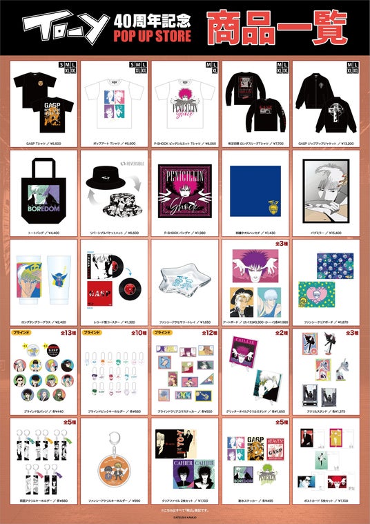 さらに、作中に登場した『GASP』『ペニシリン・ショック』などのバンド公式グッズとして、Tシャツ、ジャケット、バンダナといった定番アイテムをはじめ、アクリルキーホルダー、ステッカー、缶バッジなどコレクタブルなアイテムも充実。さらに80年代をイメージしたファンシーグッズ風アイテムも用意。音楽愛に満ちたオリジナル商品も多数販売する。