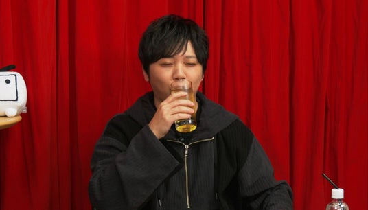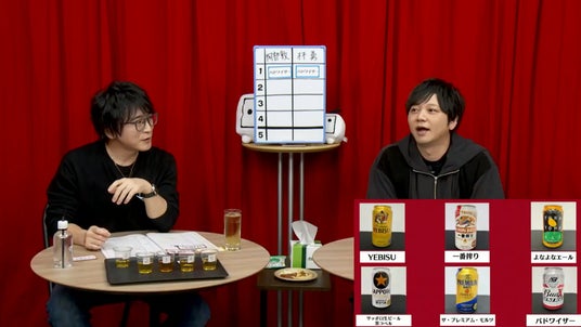 後半の「animelo+」会員限定コーナーでは、前半と同様にお酒を飲みながら阿部と林がゲームを楽しみます。最初のゲームは、お酒好きの2人ならではの「利きビールバトル」。当てるのは日本のメーカーを中心とした6種類のビールですが、実際にテイスティングするのは5種類です。つまり、1種類はグラスに入っていないダミーとなります。こうしたゲームの内容に、「ビールは好きだけど、海外のものも含めていろいろ飲むので、難しいかも」(阿部)「Me too。サッポロは好きなんでよく飲むけど、それ以外は自信がない感じ」(林)と、弱気を見せながらスタートしました。結果は、阿部が正解2つ、林が正解1つ。なお、林が好きなサッポロ生ビール黒ラベルも、飲んだ5種類に入っていましたが2人とも外すことに。そのため、「俺もう、サッポロビール好きって言うの止めます」(林)と、「ファン謹慎」を宣言。「勇さんのメンツは…」「勇さん?www」「全然ちゃう」と視聴者からもツッコミのコメントがありました。