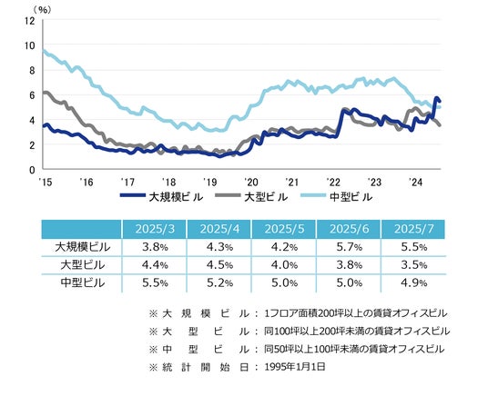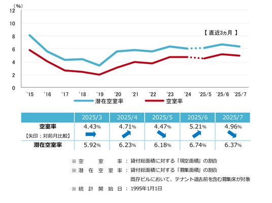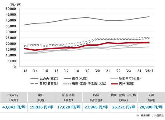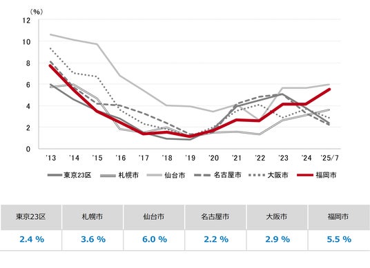 三幸エステート株式会社(本社:東京都中央区、取締役社長:福島正二郎)は、2025年7月度の福岡市オフィス賃貸状況(空室率&現空面積:全規模、募集賃料&募集面積:全規模、規模別空室率、主要エリア※1空室率:全規模)および全国6大都市(東京・札幌・仙台・名古屋・大阪・福岡)の大規模ビルのマーケットデータをまとめた「オフィスマーケット2025年8月号福岡」を公表します。