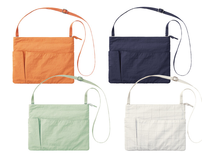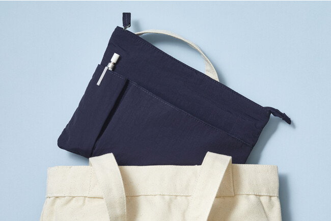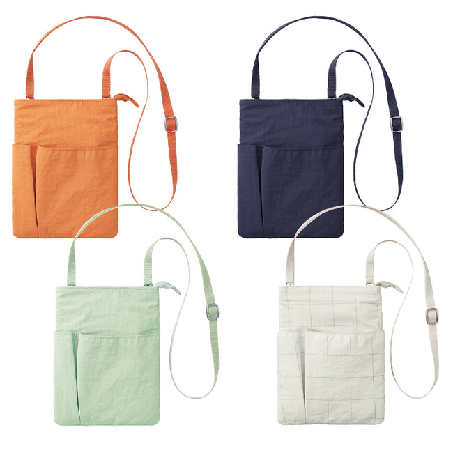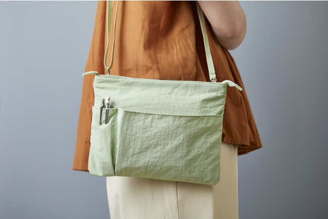 ノートや名刺など、仕事ツールを仕分けて持ち運べるショルダー付きのポーチです。軽量で、展示会や立ち仕事などのビジネスシーンをサポートします。ショルダー紐を背面ポケットにしまえるので、バッグに収納してもかさばりません。サイズ展開はA6サイズ、A5サイズの2種類で、カラーはオフィスカジュアルにも馴染みやすいオレンジ、ペールグリーン、ネイビー、シロの4色展開です。