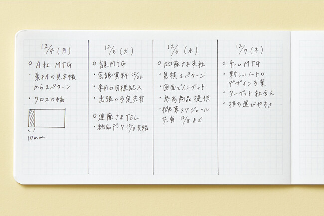 軽くて薄いため、案件ごとにノートを分けてもかさばらずに持ち運べます。また、不要となったページは中央のミシン目で切り取れるため、必要なページのみを残すことができます。