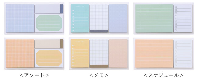 効率的な仕事をサポートする便利なフォーマットを1冊に詰め込んだふせんです。台紙は2way仕様で、デスクにスタンドさせたり、持ち運ぶ際にカバーにしたりすることができます。フォーマットは「Assort(アソート)」「Memo(メモ)」「Schedule(スケジュール)」の3種類で、仕事のスタイルに合わせて選べます。カラーは、各2色展開です。