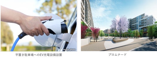 また、東急不動産の環境先進マンション「BRANZ」としての取り組みとして、太陽光パネルを設置するほか、今後の普及拡大が見込まれる電気自動車への対応を見据えた、平置き駐車場全区画へのEV充電設備設置や、「ZEH-M Oriented」の取得等により、持続可能な心地よい暮らしと環境貢献を実現します。さらに、東急不動産グループの造園会社、株式会社石勝エクステリアによる植栽を生かしたプロムナードなど、緑豊かな住環境を提供します。