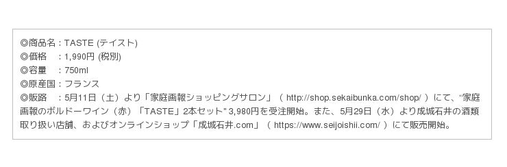 株式会社世界文化社(本社:千代田区九段北、代表取締役社長:鈴木美奈子)が刊行するハイクオリティマガジン『家庭画報』は、株式会社成城石井(本社:神奈川県横浜市西区北幸、代表取締役社長:原明彦)とのコラボレーション企画から、初のオリジナルワイン「TASTE」を、2019年5月29日(水)に発売します。