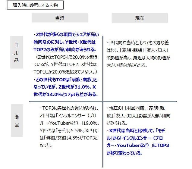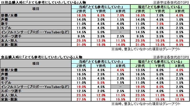 また、Z世代に関して、日用品は「俳優/女優」がTOP3、食品は「インフルエンサー(ブロガー・YouTuberなど)」TOP3で、購入するもので参考にしている人物が異なっていた。