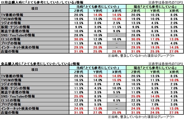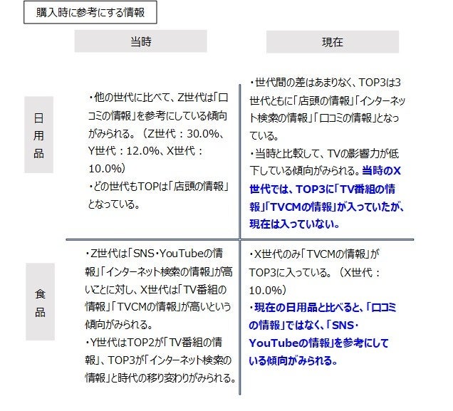 また、日用品はX世代含め、TVからネットの情報に移行しているが、X世代は食品購入時、TVCMの情報を参考している結果となった。
