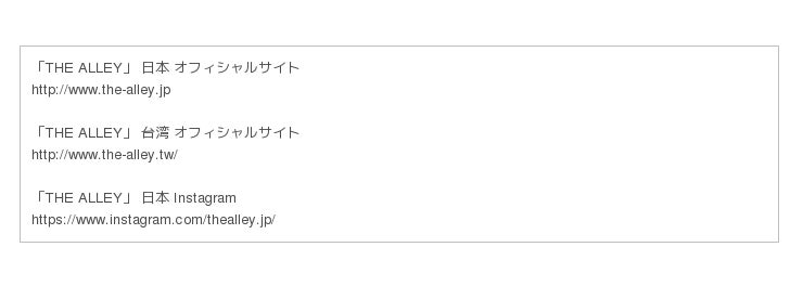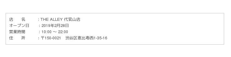 「THE ALLEY」は、2017年7月に、サナギ新宿にて日本初上陸。翌月8月、表参道での旗艦店オープンを皮切りに、渋谷店、ルミネ新宿店、恵比寿店、自由が丘店をオープン。