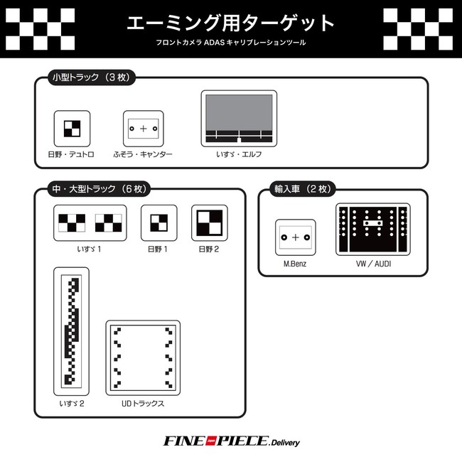 ツールプラネット エーミングターゲット 国産乗用車12枚、小型トラック3枚、中型・大型トラック6枚(いすゞ、日野、ふそう、UDトラックス)、輸入車2枚(メルセデス、BMW、VW、アウディ、ポルシェ等)
