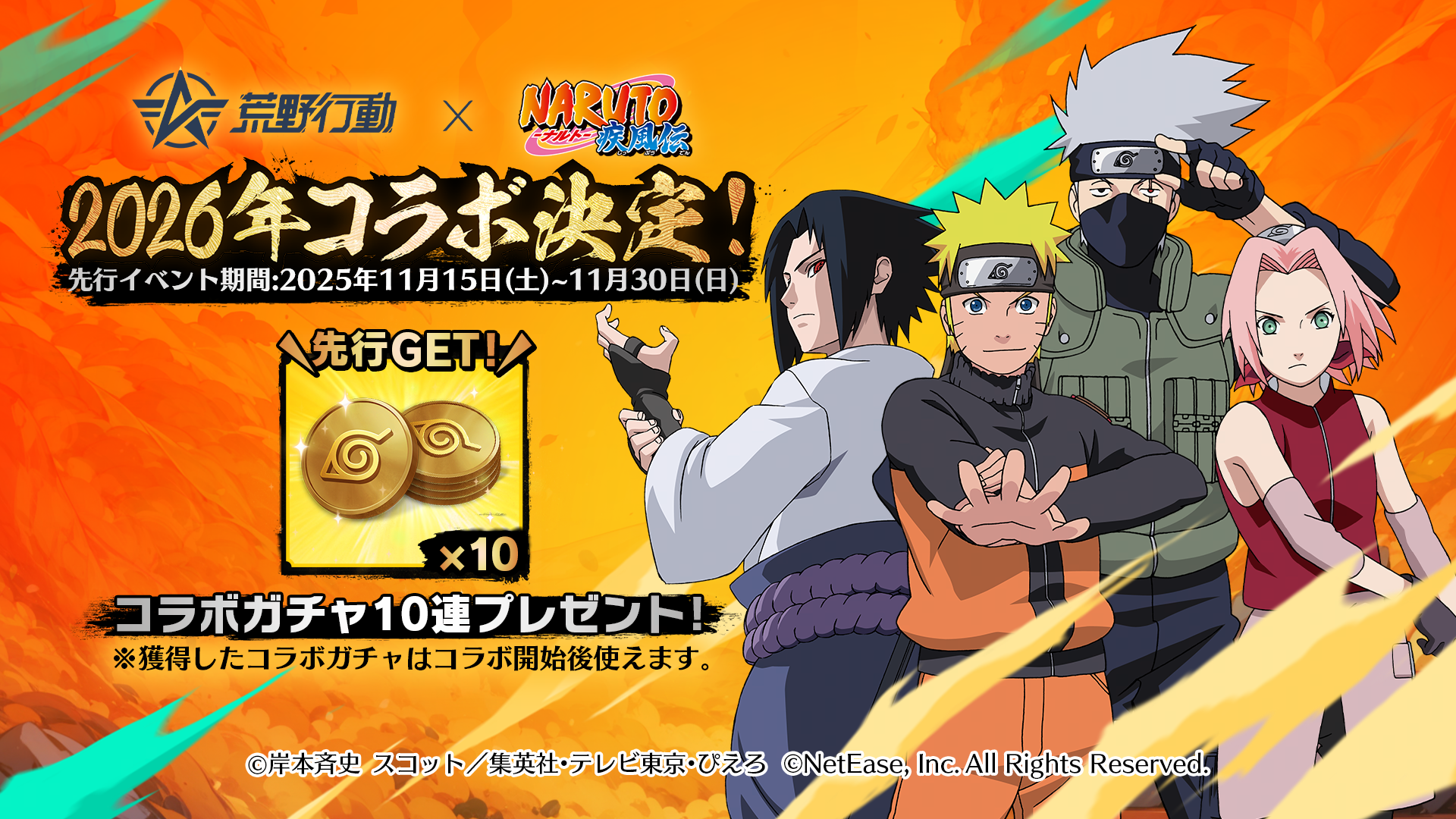 2025年11月に8周年を迎えたスマホゲーム『荒野行動』は、2026年中に『NARUTO-ナルト- 疾風伝』とのコラボイベントを開催いたします。