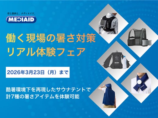 日本生まれのサポーター専業ブランド「MEDIAID(メディエイド)」を展開する、日本シグマックス株式会社(本社:東京都新宿区、代表取締役社長:鈴木洋輔)は、本社内にて、企業ご担当者様向けにメディエイド最新冷却服を含む複数アイテムを比較検討できる「働く現場の暑さ対策リアル体験フェア」を期間限定で開催いたします。