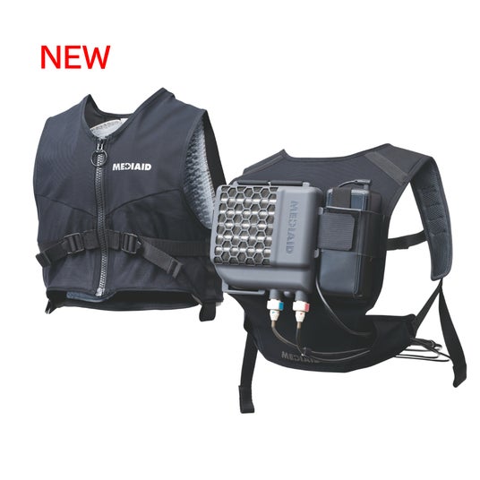 1.メディエイド アイシングギア ベスト2 (ペルチェ式冷水循環服)ペルチェと水冷式をかけ合わせ、35℃以上の酷暑環境下でも5時間しっかり冷却。