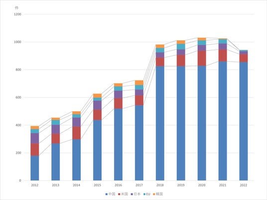 つぎに、出願特許の件数を確認します。テラヘルツ技術に関連する特許の国別出願件数の年次推移が図2です。
