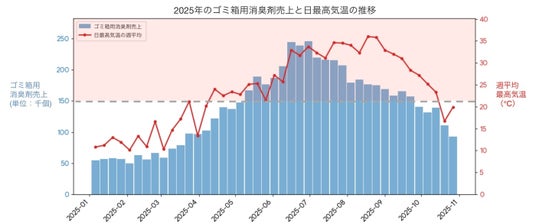 さまざまな気象情報を取り扱う株式会社ウェザーニューズ協力のもと、2025年におけるゴミ箱用消臭芳香剤の売上と気温の相関関係を分析したところ、気温の上昇に伴い販売数も増加していることがわかりました。とくに、生活者が「暑くなってきたな」と体感する、日中の最高気温が21℃から27℃で販売数が加速する傾向に。