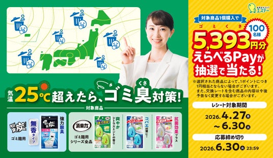 本キャンペーンは、キャンペーン期間中に対象品の「消臭力 ゴミ箱用」シリーズ全品と「脱臭炭 ゴミ箱用」の中から、製品を1個以上購入の上、WEBサイトから参加が可能。応募者の中から抽選で100名様に「えらべるPay」を 5,393(ゴミくさ)円分プレゼントします。