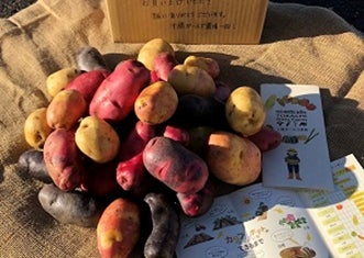 ピンクや紫など色や形、風味も様々なジャガイモを袋詰めして販売します。