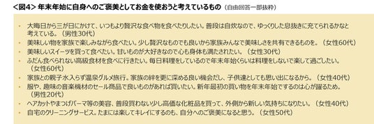 年末年始のご褒美としてお金を使いたいものは、いつもより贅沢な食事や普段は買わない高級食材などがあげられた。理由としては「ゆっくりと息抜きをしたい」「楽して過ごしたい」「心も身体も満たされたい」といった声がみられた。<図4>