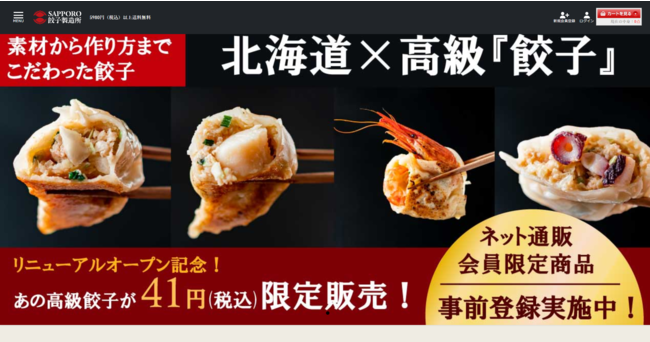 4月よりオンラインショップもリニューアル、「SAPPORO餃子製造所」で人気の餃子をキャンペーン価格にて数量限定でご紹介するキャンペーンを開催いたします。「SAPPORO餃子製造所」が作る餃子は、グルメな人も唸る味。『贈りたい餃子ギフト』として選ばれるこの餃子を、ぜひご自宅でご堪能ください。