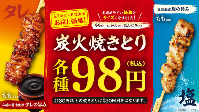 「炭火焼きとり」のリニューアルを記念して、お試し価格として各種「税込98円」にて販売します。お求めやすい価格とサイズに生まれ変わったファミマの焼きとりを、この機会にぜひお試しください。