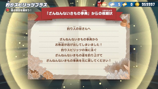 ▲『ざんねんないきもの事典』から逃げ出した魚を釣って事典に戻すと報酬が獲得できます。
