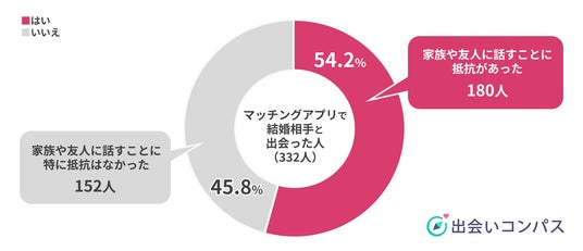 続いて、「マッチングアプリで知り合った相手と結婚した」と回答した332人に「マッチングアプリで出会った相手と結婚することを家族や友人に話すことに抵抗があったか」を質問したところ、54.2%(180人)の人が抵抗があったと答えました。