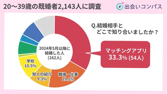 今回の調査では、結婚に至った出会いのきっかけとして「マッチングアプリ」が定番化しつつある実態が浮き彫りになりました。特に、2024年5月以降に結婚した人のうち約3人に1人(33.3%)がマッチングアプリ婚であり、年々その割合が増加しています。